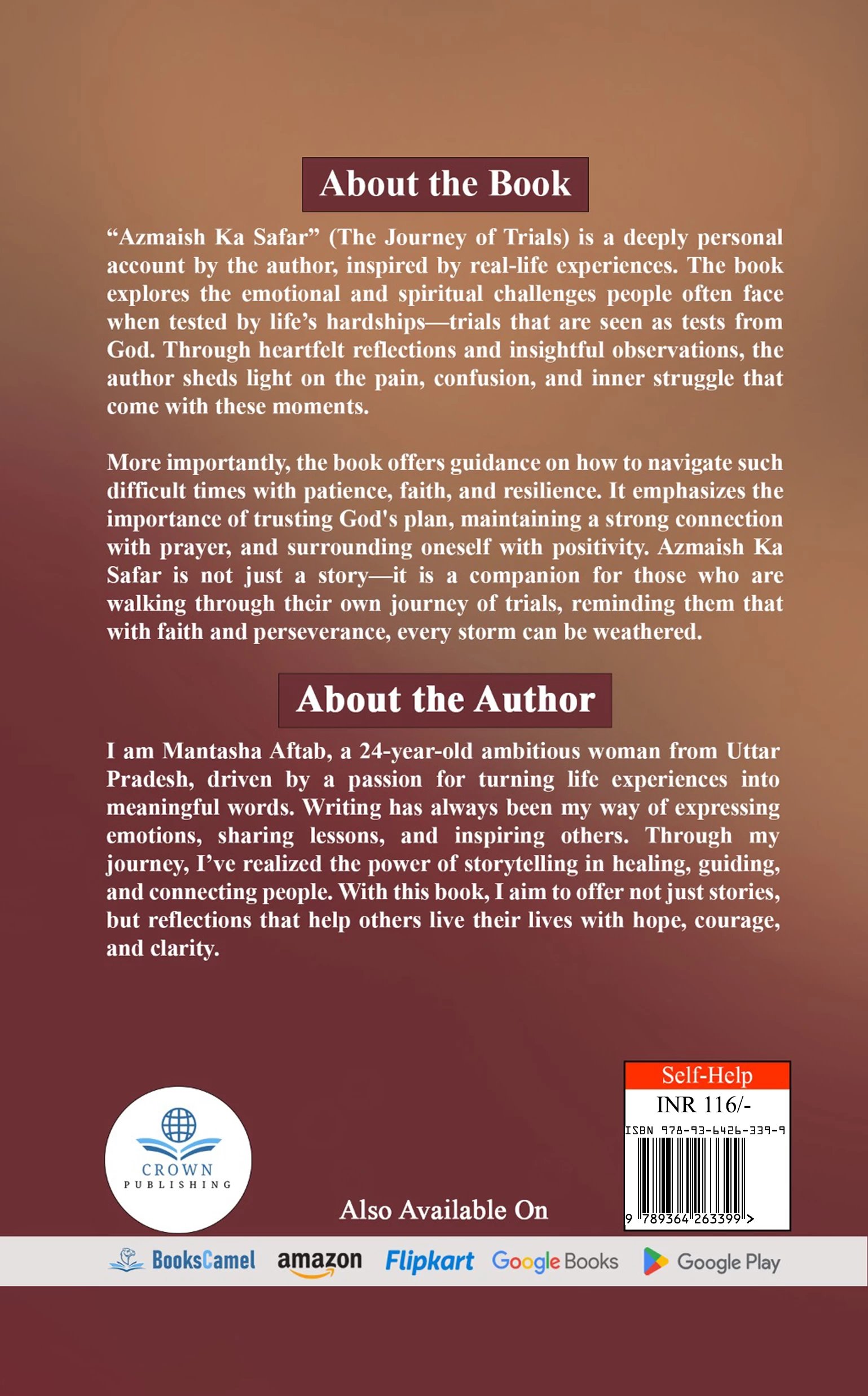 I am Mantasha Aftab, a 24-year-old ambitious woman from Uttar Pradesh, driven by a passion for turning life experiences into meaningful words. Writing has always been my way of expressing emotions, sharing lessons, and inspiring others. Through my journey, I’ve realized the power of storytelling in healing, guiding, and connecting people. With this book, I aim to offer not just stories, but reflections that help others live their lives with hope, courage, and clarity.