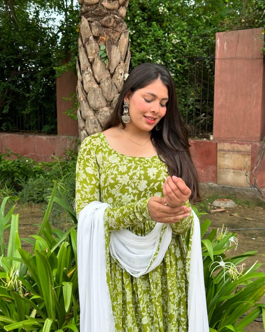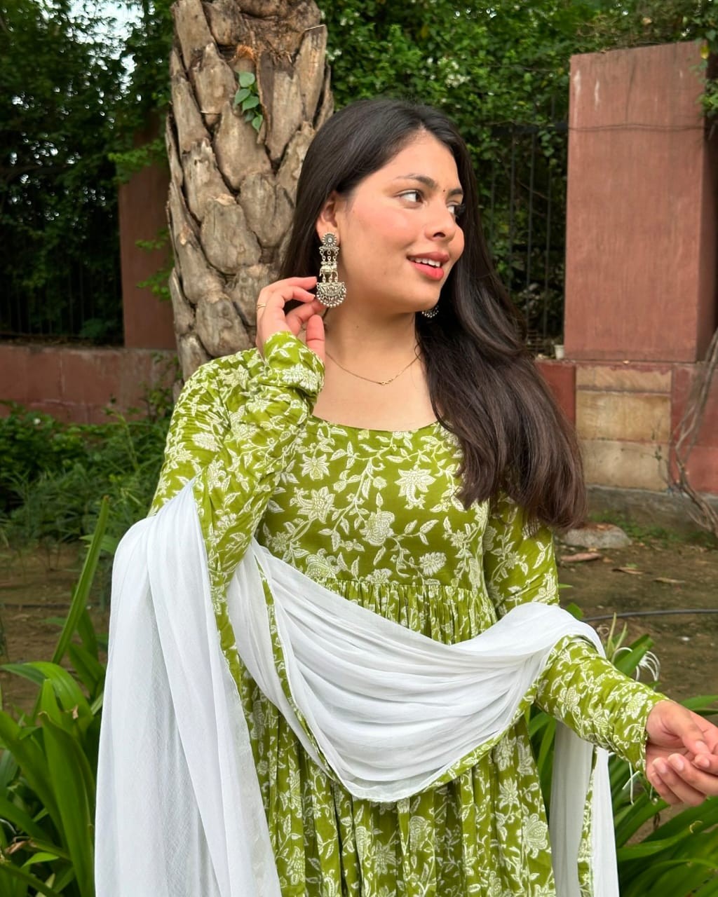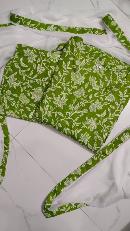 New Leaves Floral Print Anarkali Style kurti, Pant with Chiffon Dupatta
