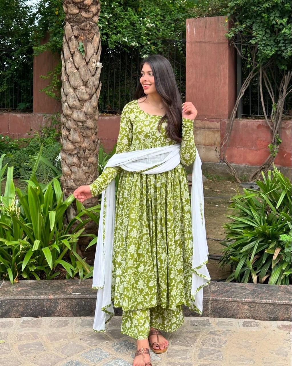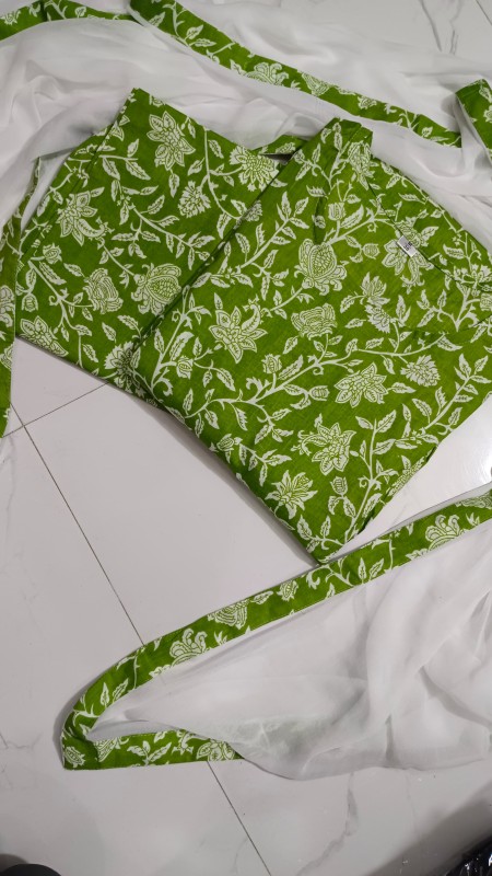 New Leaves Floral Print Anarkali Style kurti, Pant with Chiffon Dupatta