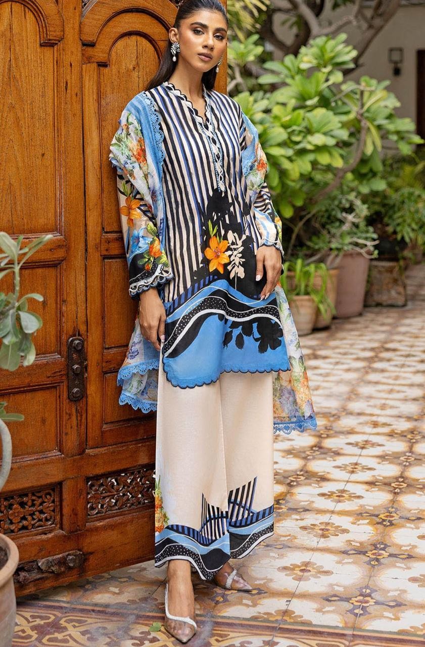 ?This luxe limited edition? 3 pc set( Top + pants + dupatta) features a mix of stripes, floral patterns which are Fresh, contemporary, and bold with an artistic touch.